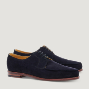 Schlichter Herrenschuh im Schnittmuster des Derby, gefertigt aus feinstem Veloursleder mit einer charakteristischen Naht an der Spitze des Schuhs. Der Norweger ist ein klassischer Begleiter für sportliche und elegante Anlässe.