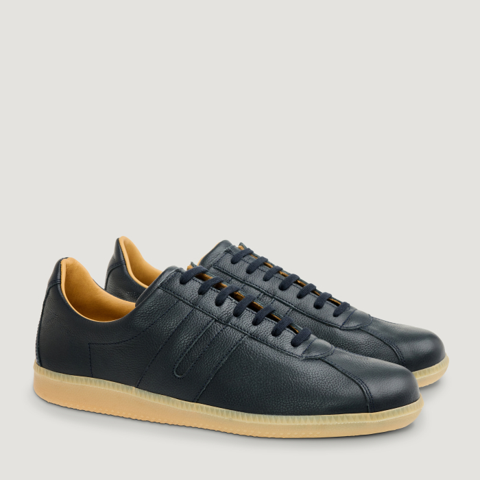 Ikonisch, flott und ultra-bequem präsentiert sich der Trainer diese Saison gänzlich in Marineblau aus Golf Grain Leder mit den charakteristischen U-Streifen an den Seiten. Dieses Modell wurde auf dem Champion Leisten gefertigt und eignet sich daher für breitere Füße.