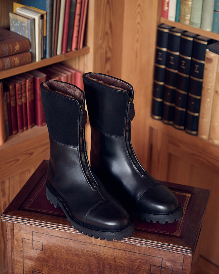 Based on Hungarian cavalry boots and Alpine Ski boots, famous from 'Inglorious Basterds': the Husarenstiefel. Durable boots made of bark-tanned leather with a refined strap buckel. Goodyear-welted on Kitzmantel-last with leather lining and rubber soles.