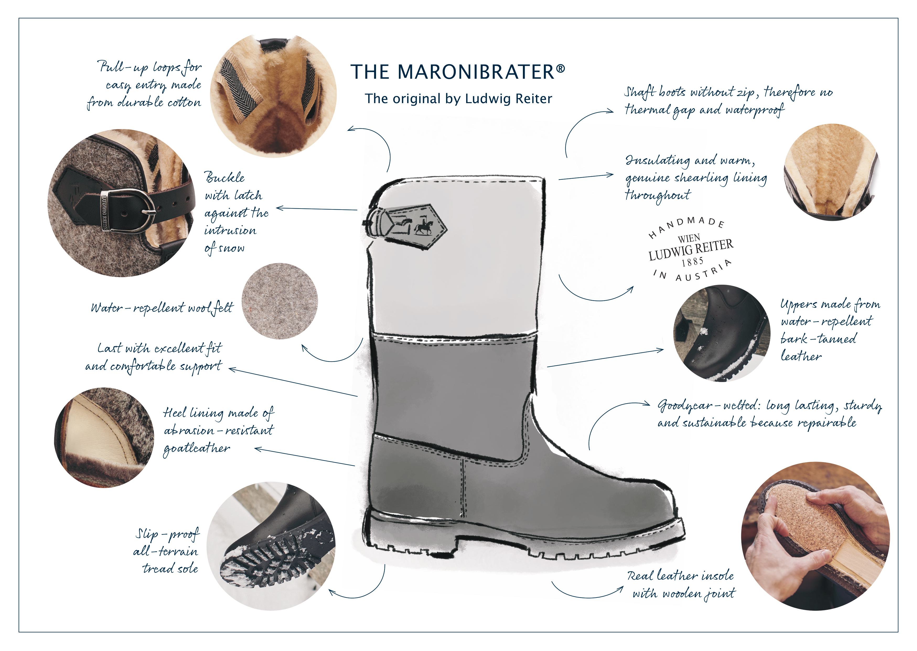 The Maronibrater® was originally a felt boot with leather trimming for lumberjacks and mountain farmers. As they were ideal for spending the whole day outdoors even in freezing cold weather, they were soon brought to the city by market people. There they became known a hundred years ago as a typical item of clothing for the Maronibrater (engl. chestnut roasters), who were very popular in Vienna in winter. The fact that such an old-fashioned product has become standard equipment for all discerning winter enthusiasts between Kitzbühel and Kampen, Sankt Moritz and Aspen is due to its very traditional qualities, which have been perfected to meet modern demands through a detailed redesign.