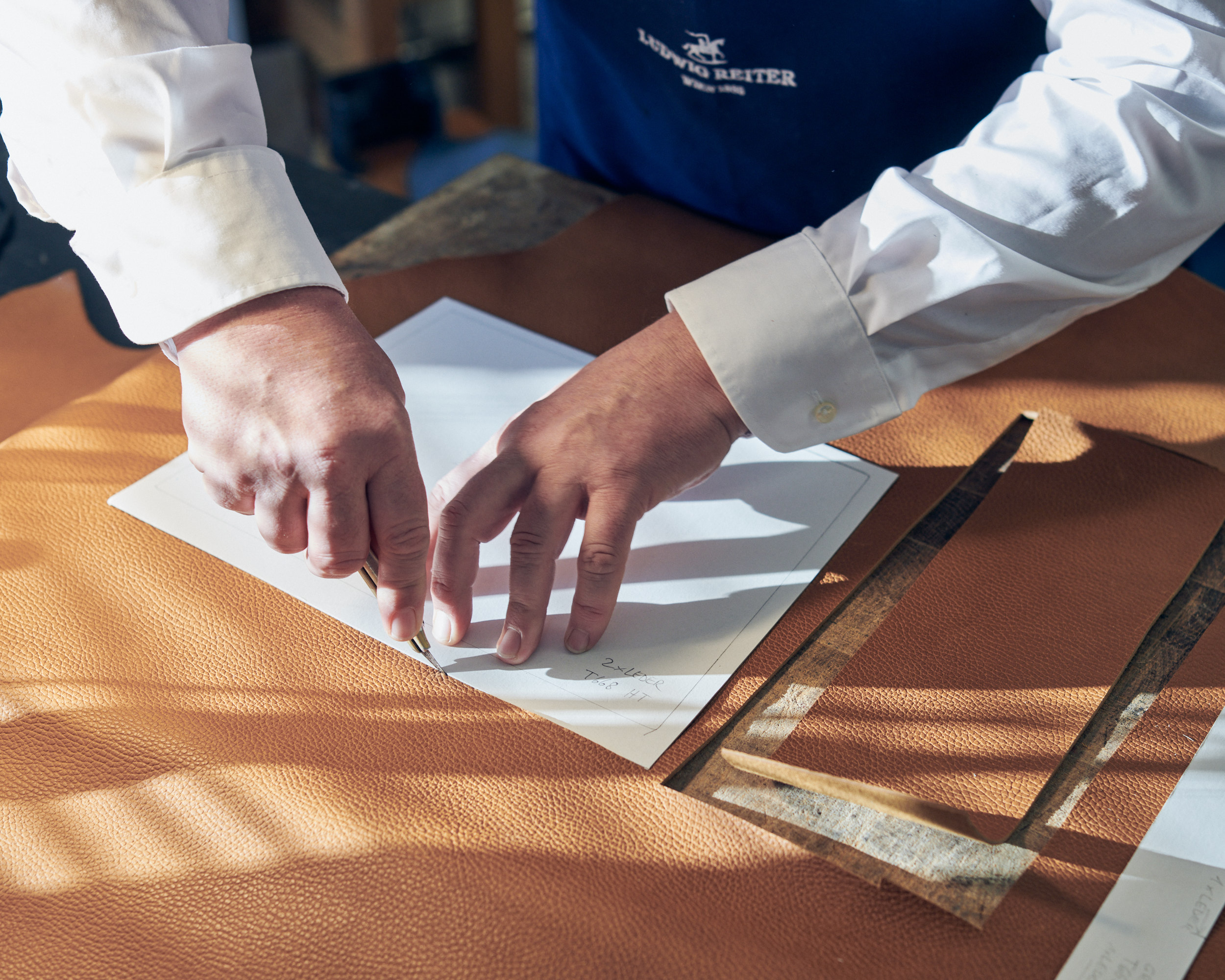 The fine leather is hand-cut with a feather knife.