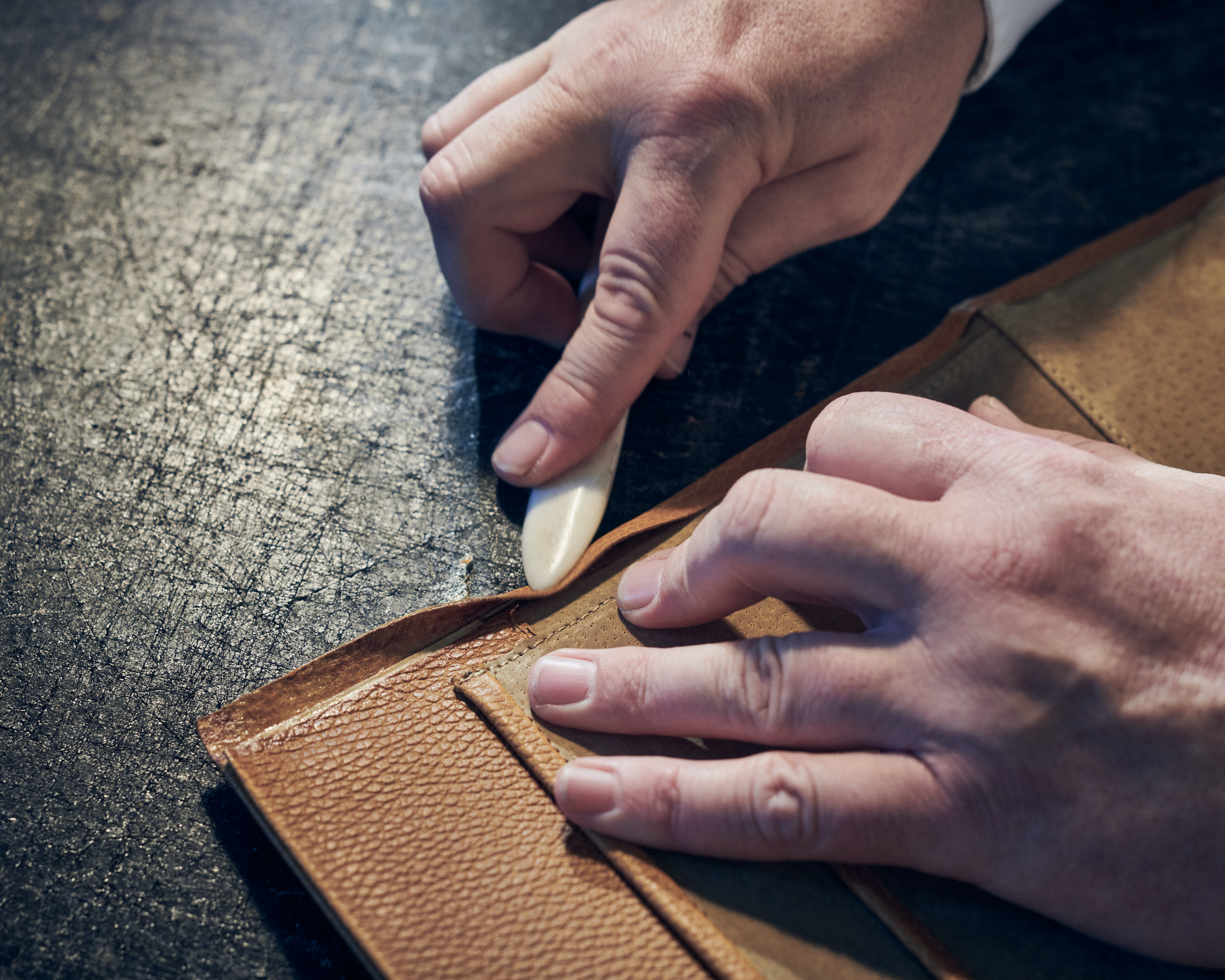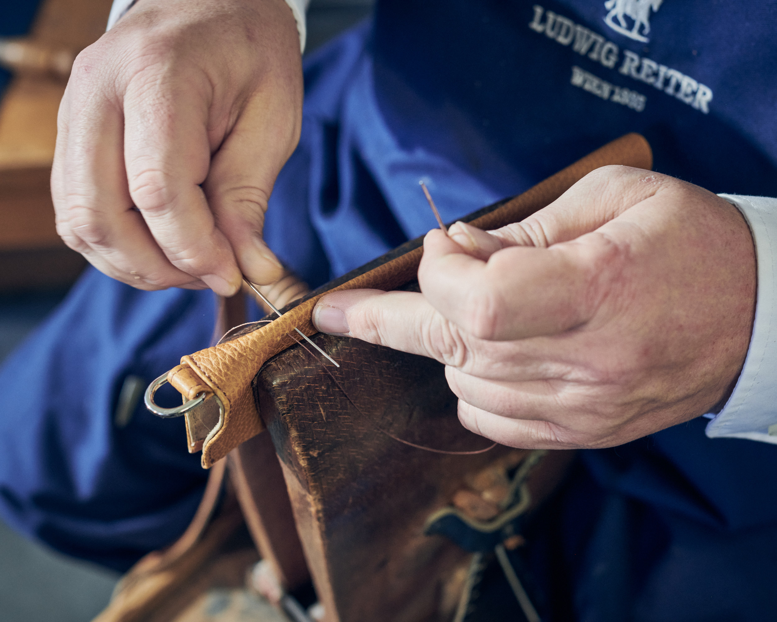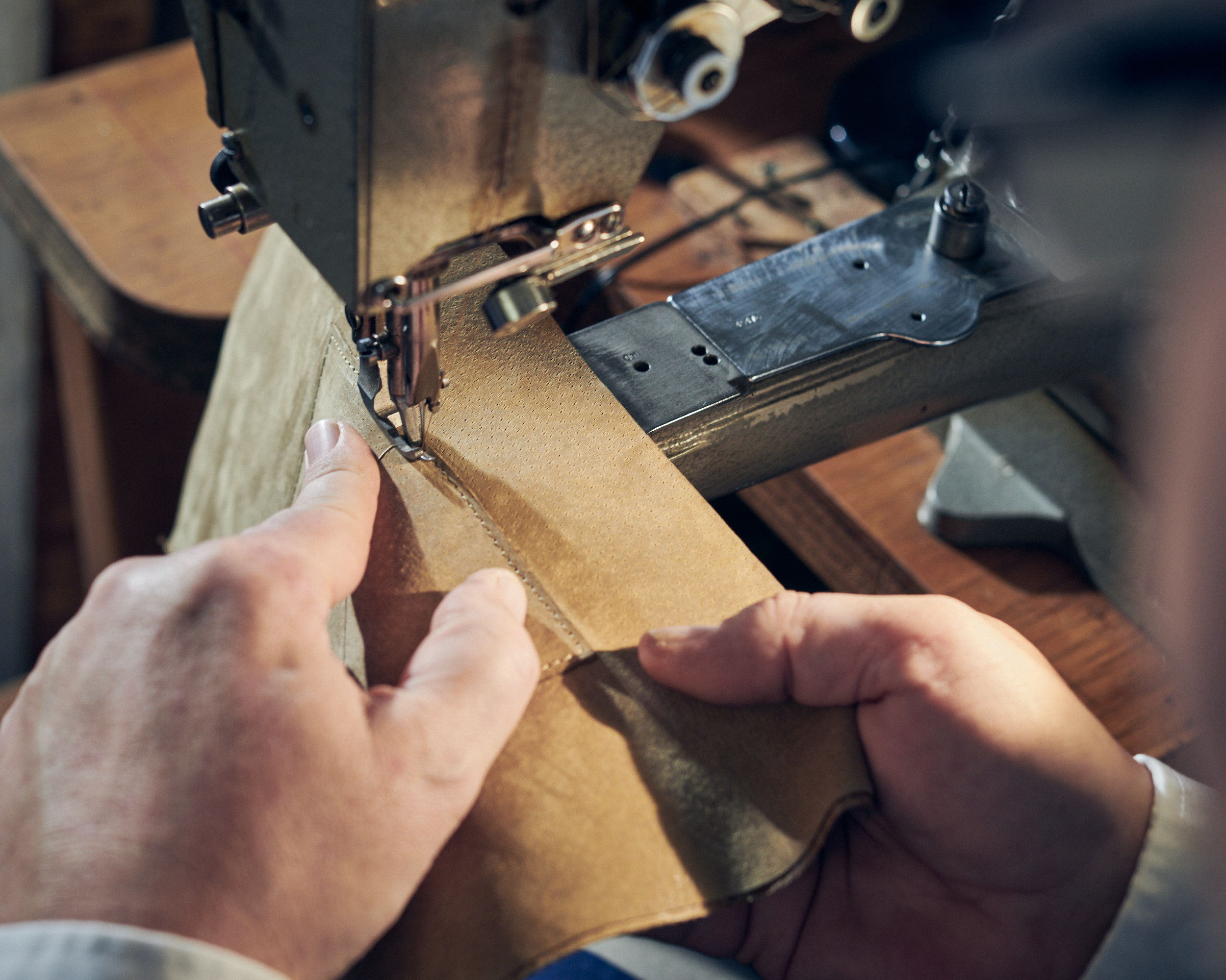 The handle and the side pleats are handstitched on the so-called “horse.”